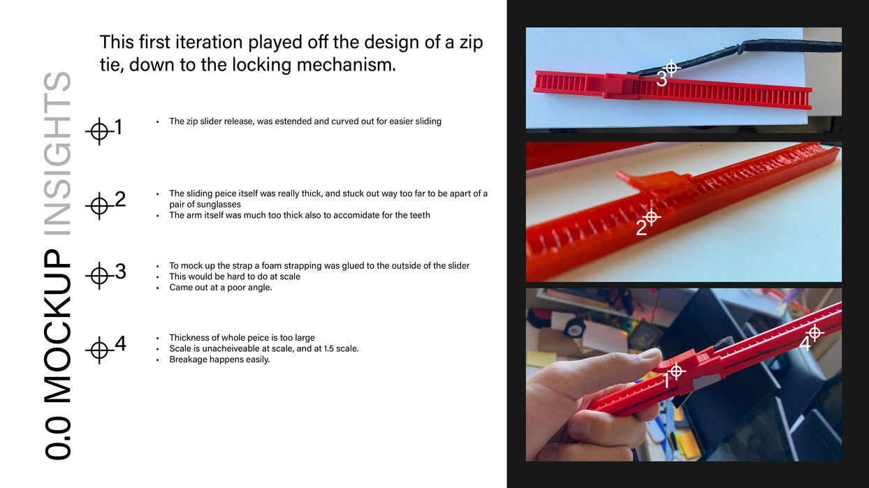 Designing a compliant mechanism that could lock and slide the part along the arm of the sunglasses. This feature creates an effective and smooth sinching mechanism on a small scale.